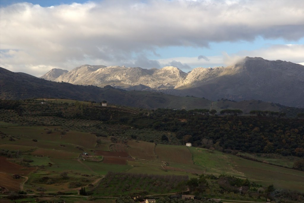 Rolnicze krajobrazy, a w tle łańcuchy górskie